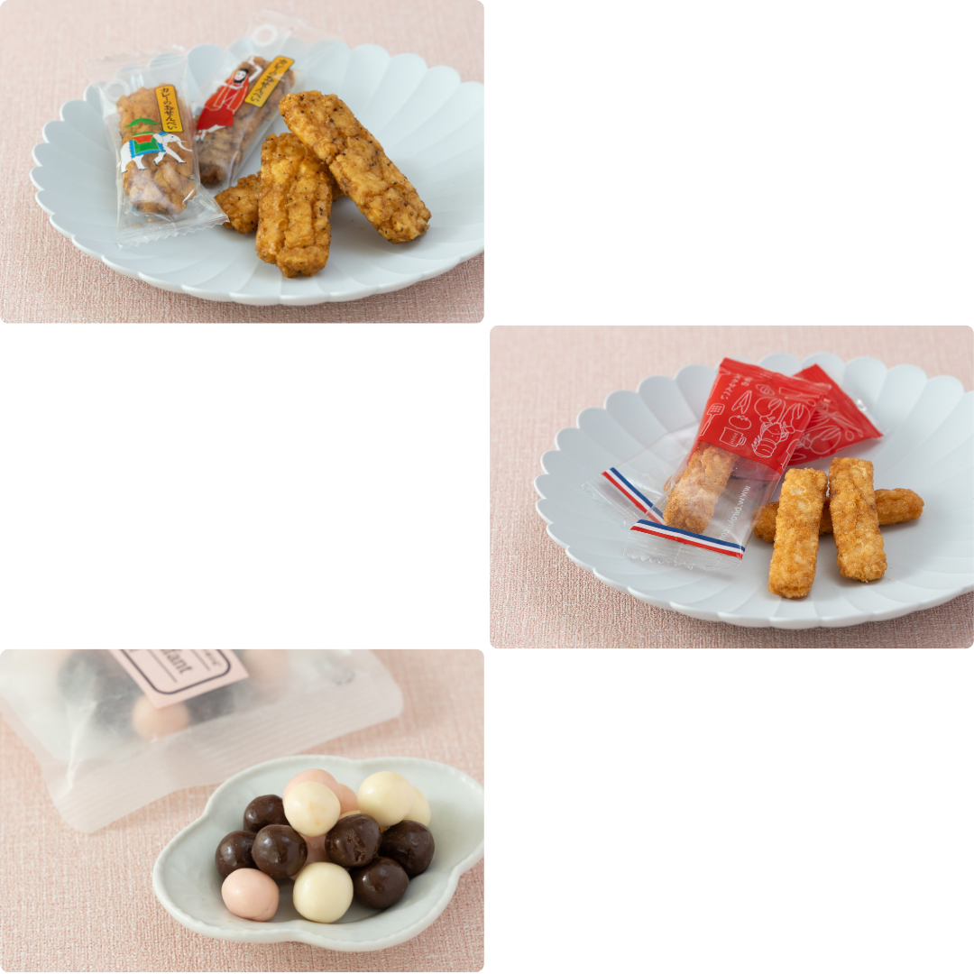 【カレーのおせんべい】米油とパーム油のブレンド油でカラッと揚げたおかきを和風仕立てのカレーだれに漬け込んでいます。ブラックペッパーを利かせたスパイシーな味わいで、ひとつ食べると「もうひとつ…」と手が伸びるクセになるおいしさです。 【海老のビスクせんべい】国産うるち米100%の生地を濃厚なビスクスープ風の特製たれにじっくり漬け込んでいます。ワインやシャンパンなどお酒とも相性抜群で、食卓や晩酌の時間を上質に彩ります。海老のうまみを最大限に引き出した、クリーミーで奥深い贅沢な味わいをお楽しみ下さい。 【ショコラ アンファン】おつまみ感覚で食べられる食感が楽しいチョコあられ。チョコレートとあられの甘辛のバランスがたまらない一品です。ミルクチョコレート・ストロベリー・ホワイトの3種の味のミックスで、1粒ずつでも、3つの味を一緒に食べてもおいしく味わえます。