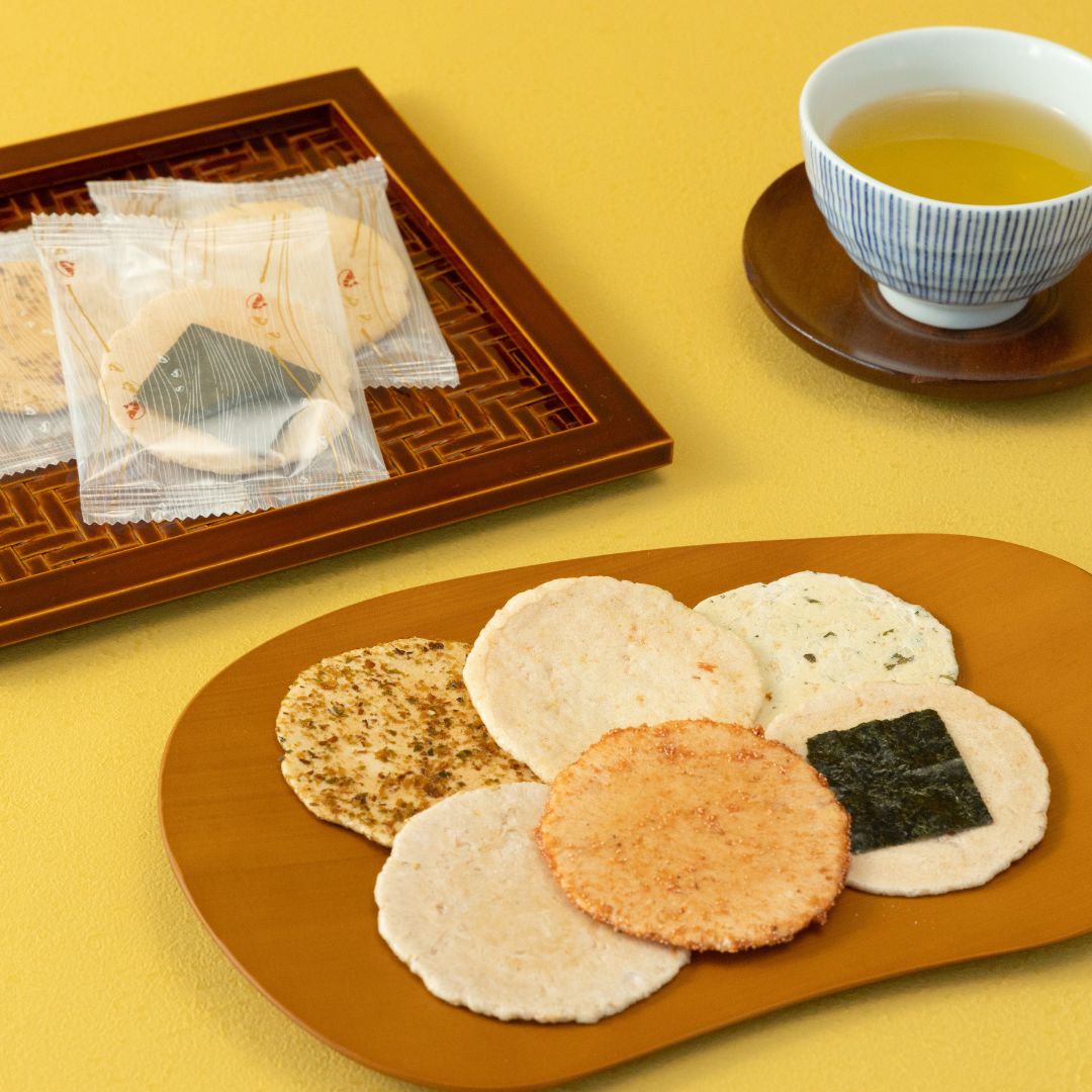 【かつお味】たっぷり使ったかつお削り節の奥深いうまみに、あおさ、ごまの香ばしさが重なり、やさしい甘口に仕上げました。誰からも愛される味わいです。 【めんたい味】オリジナルのめんたいダレを付け、低温乾燥でめんたいの風味をしっかり残す製法。程よい刺激とうまみがクセになります。 【じゃこ味】にんにくと小魚を使い、香ばしさのアクセントが光る、ちょっと大人のおやつタイムにぴったりの一枚です。 【桜えび味】油で揚げてサクサクッとした食感に。桜えびの香りが引き立ち、より一層海老の香ばしさをお楽しみいただけます。 【焼き海苔味】えびせんの味わいを海苔の香りでぐっと引き立て、焼き海苔を手作業で一枚ずつ貼るこだわりの工程で仕上げました。 【わかめ】わかめをたっぷりを使用し、噛むごとに海の風味が広がるホッとするえびせんべい。和のテイストを求める方へ。