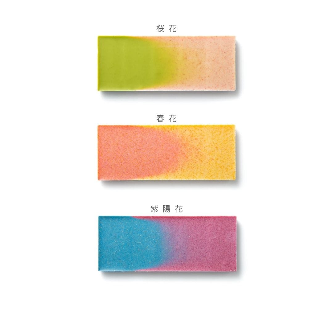 【桜花】程よい酸味のラズベリーと、爽やかな渋みの抹茶を合わせ、日本の春を象徴する桜風味をプラス。口に含むとほのかな桜の風味と、しっかりとした粒感を感じられます。ほんのりした塩加減がホワイトチョコレートの甘さを引き立て、桜餅のような風味をお楽しみいただけます。 【春花】芳醇な香りのいちごと甘酸っぱいパッションフルーツの組み合わせ。甘味と酸味が絶妙にミックスされた、春に咲く花を感じる爽やかな味わいです。 【紫陽花】ブルーベリーの豊かな甘酸っぱさと、ピールの程よい苦みが爽やかなレモン。二つの風味の対比が楽しめる組み合わせです。梅雨の雫で輝く紫陽花の繊細な色を、2色のグラデーションで表現しました。