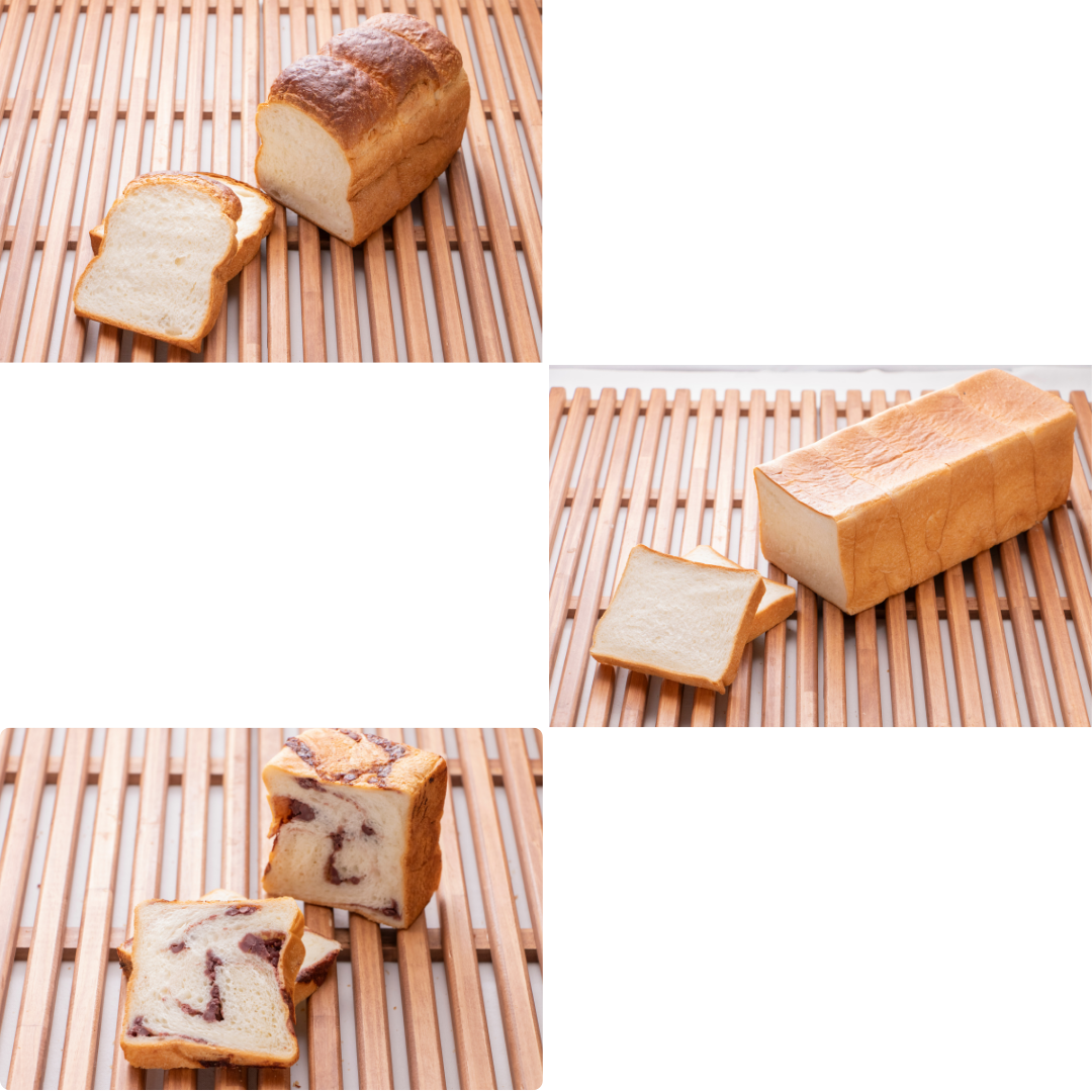 【湯種もちもちトースト】 創業以来の看板商品で、雪のようなくちどけが自慢の食パンです。こだわりの湯種製法で仕上げ、もっちりとした食感は格別です。贅沢に厚切りでお楽しみ下さい。 【石窯工房食パン】 じっくりと長時間発酵させ、石窯の遠赤外線効果で生地の中心まで素早く熱を届けることで、歯切れがよく仕上がっています。ほんのりとしたミルクの風味を感じるスタンダードな食パンで、サンドイッチなどにもぴったりです。 【あん食パン】 北海道十勝小豆100%を贅沢に使用。生クリーム入りのふんわりとした生地に、自家製つぶあんをたっぷり編み込んだ贅沢な食パンです。バターを塗ってトーストすると名古屋名物の「あんトースト」に。