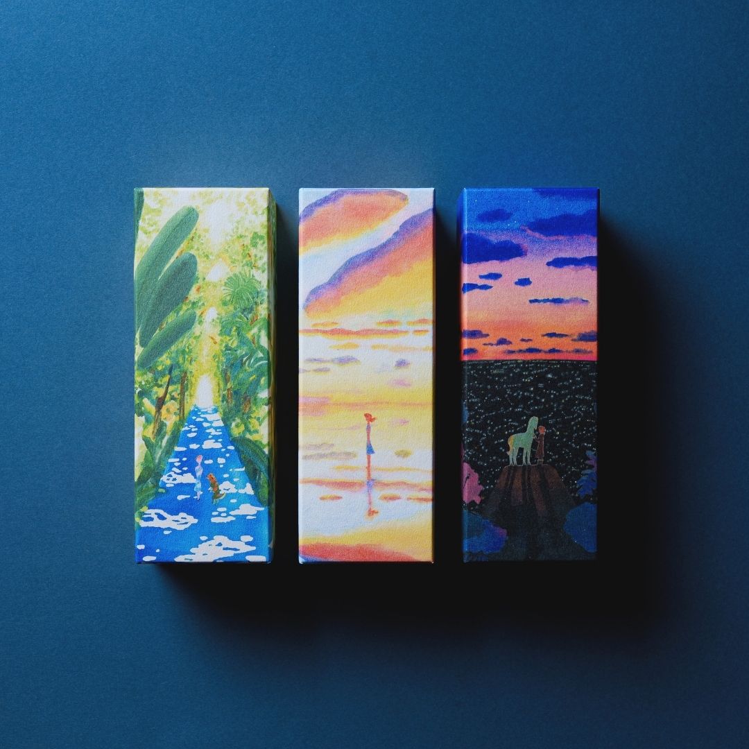 いくつもの色を重ね、詩情に満ちた情景を描いた美しいパッケージはイラストレーターの山口洋佑さんによるもの。樹・渚・灯のサブレセットをオリジナル特製ボックスに入れてお届け。また、オリジナル特製ボックスを積み重ねて入れることができる紙袋を1つお付けいたします。