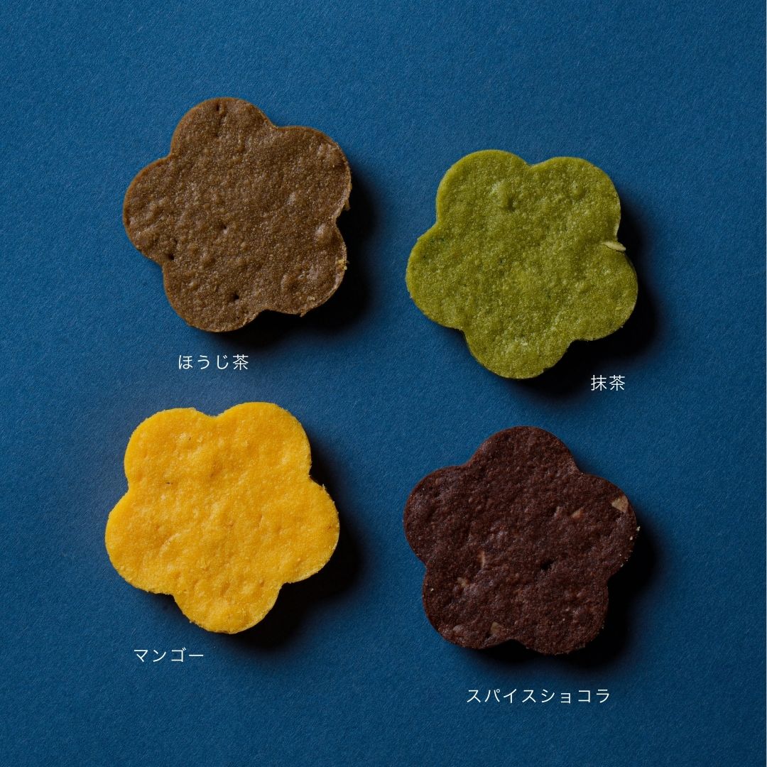 【スパイスショコラ】 カルダモンとシナモンをカカオ分100%のココアパウダーと合わせ、皮付きのローストアーモンドを練りこみスッキリとした味わいに仕上げました。 【ほうじ茶】 静岡県産のほうじ茶を使用した上品な渋みが特徴の大人な一品です。 【抹茶】 愛知県西尾産の抹茶を贅沢に使い、しっかりと抹茶を感じられる生地に低温でじっくりとローストしたスライスアーモンドを練りこみました。 【マンゴー】 マンゴー果汁を濃縮した粒状のゼリーを練りこみ、程よい果実味が感じられる仕上がりとなっています。